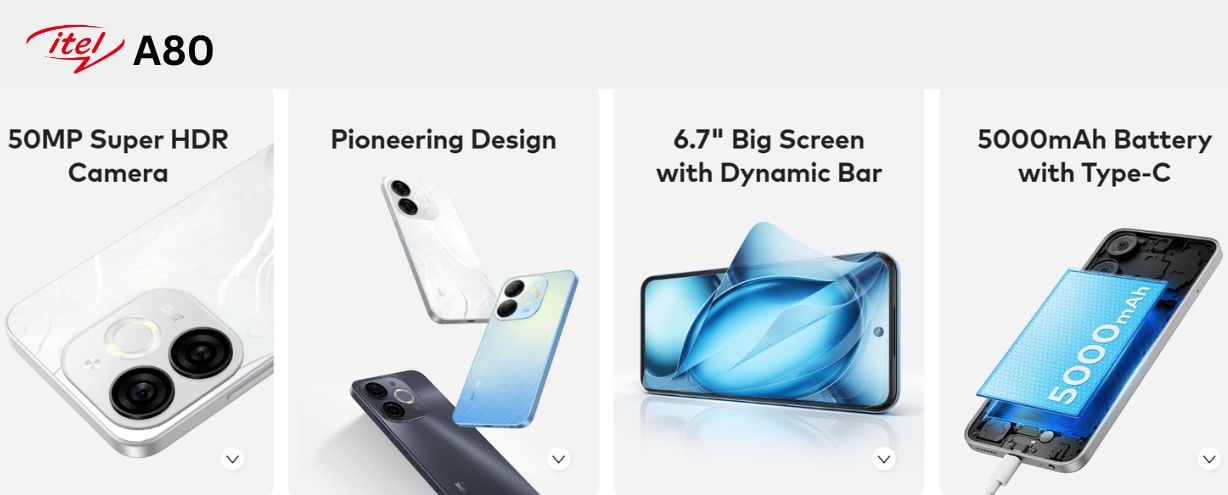 يتميز هاتف itel A80 بتصميم أنيق وأداء يعتمد عليه، مع شاشة كبيرة وبطارية تدوم لساعات طويلة، ليكون الرفيق المثالي في المهام اليومية.